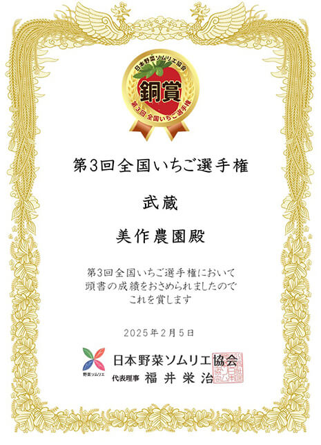 いちご栽培を26年追求し、美味しさが認められ賞をいただきました。
