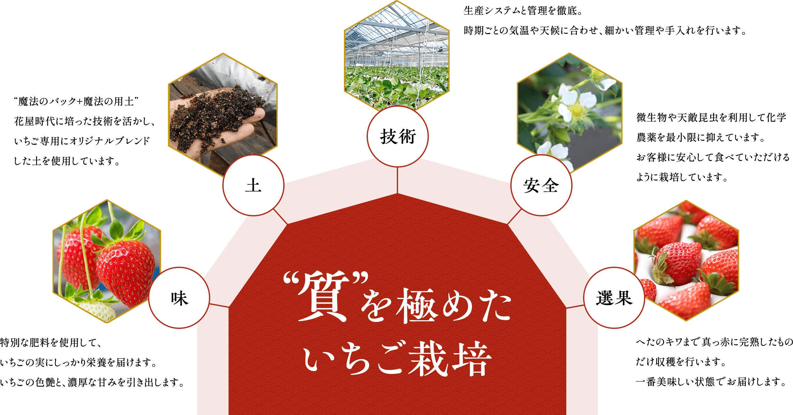 日々の天候をチェックし、細かい温度・施設・肥料の管理など、いちごに最適な環境作りを心掛けています。