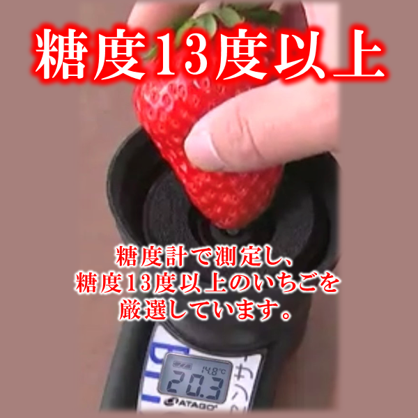 香り高く、美味しく育った大粒完熟いちご(糖度13度以上)を厳選しています。